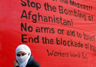 a Muslim woman stands in front of one of the banners carried by the marchers. |